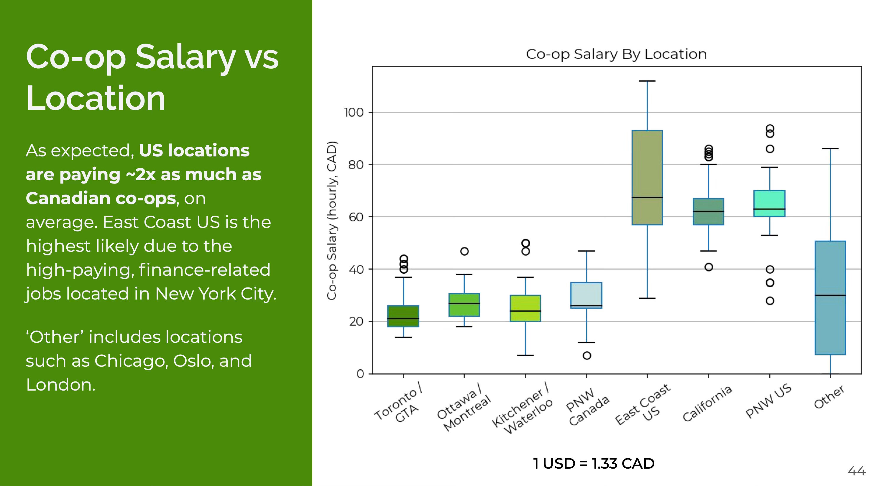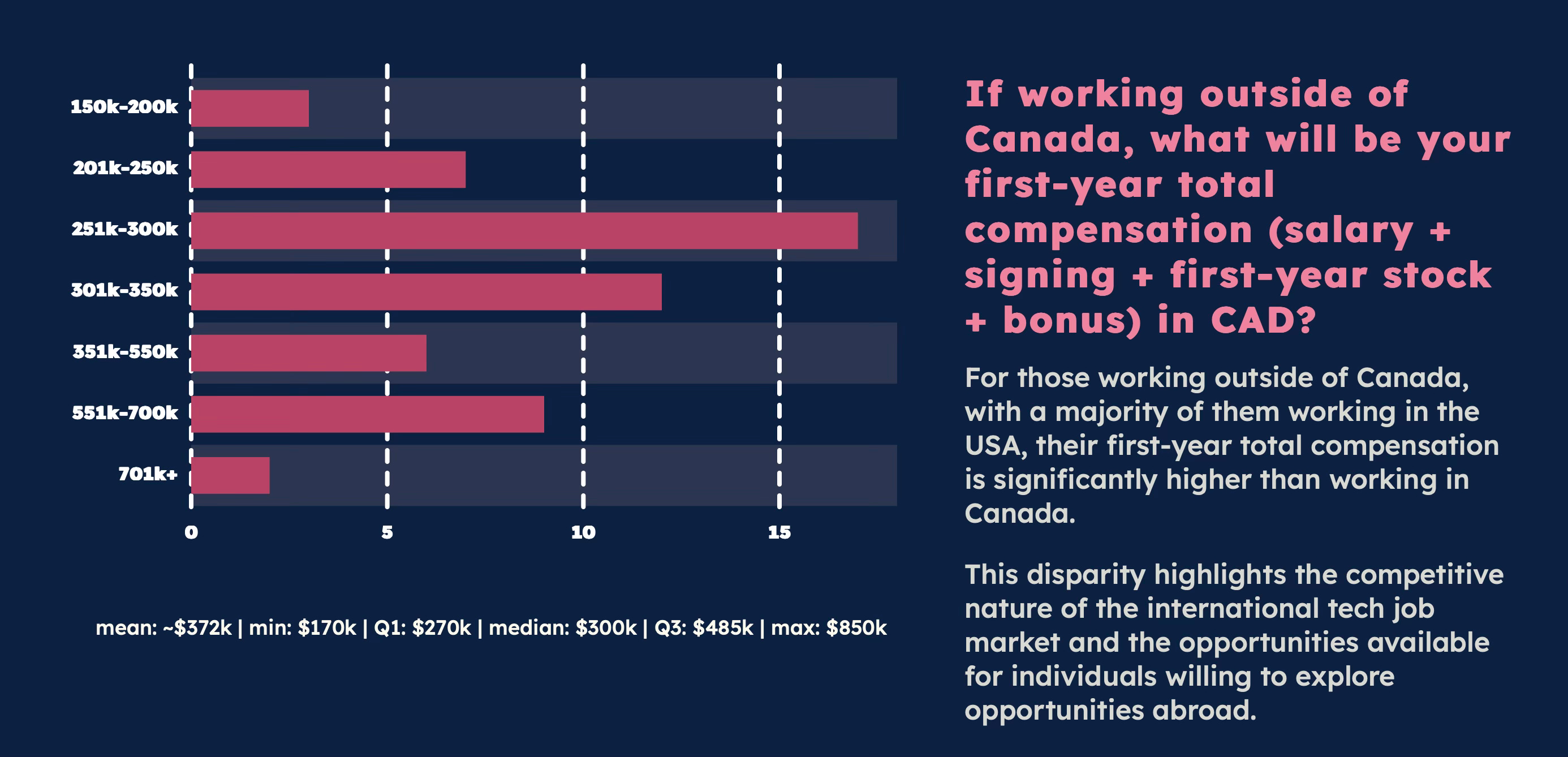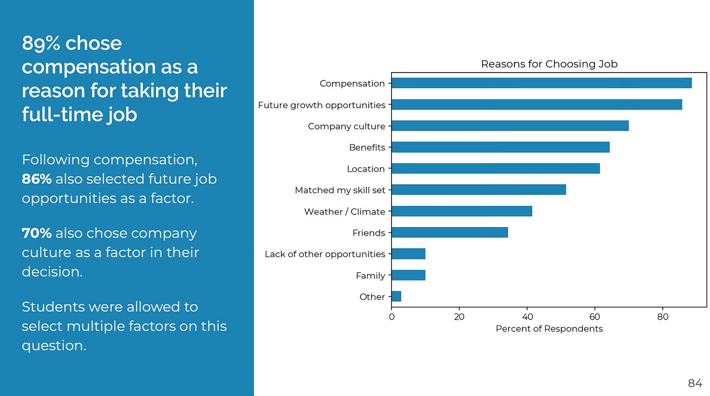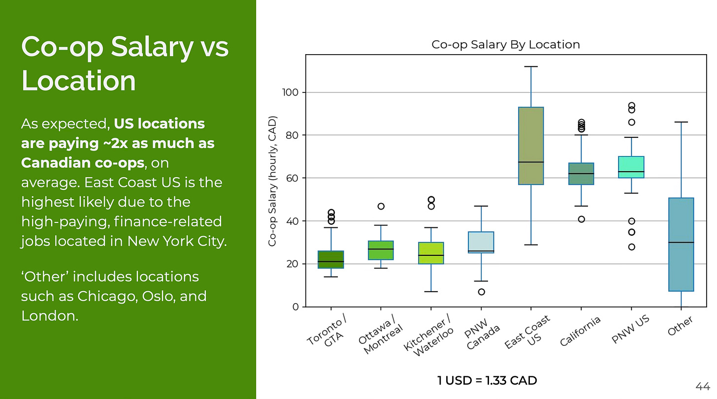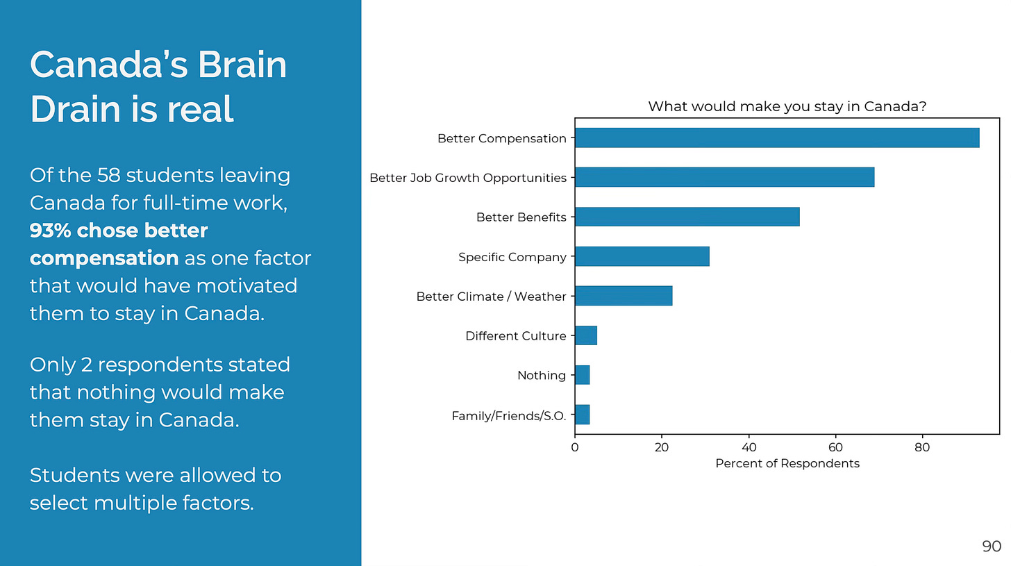 What undergrad wouldn’t want to work in the US over Canada? Compensation is a no brainer. Students build their professional networks in the US. Stack up a couple internships and it’s only getting more likely to get a full-time offer to go back. Unsurprisingly, compensation is the #1 reason students choose to leave Canada.