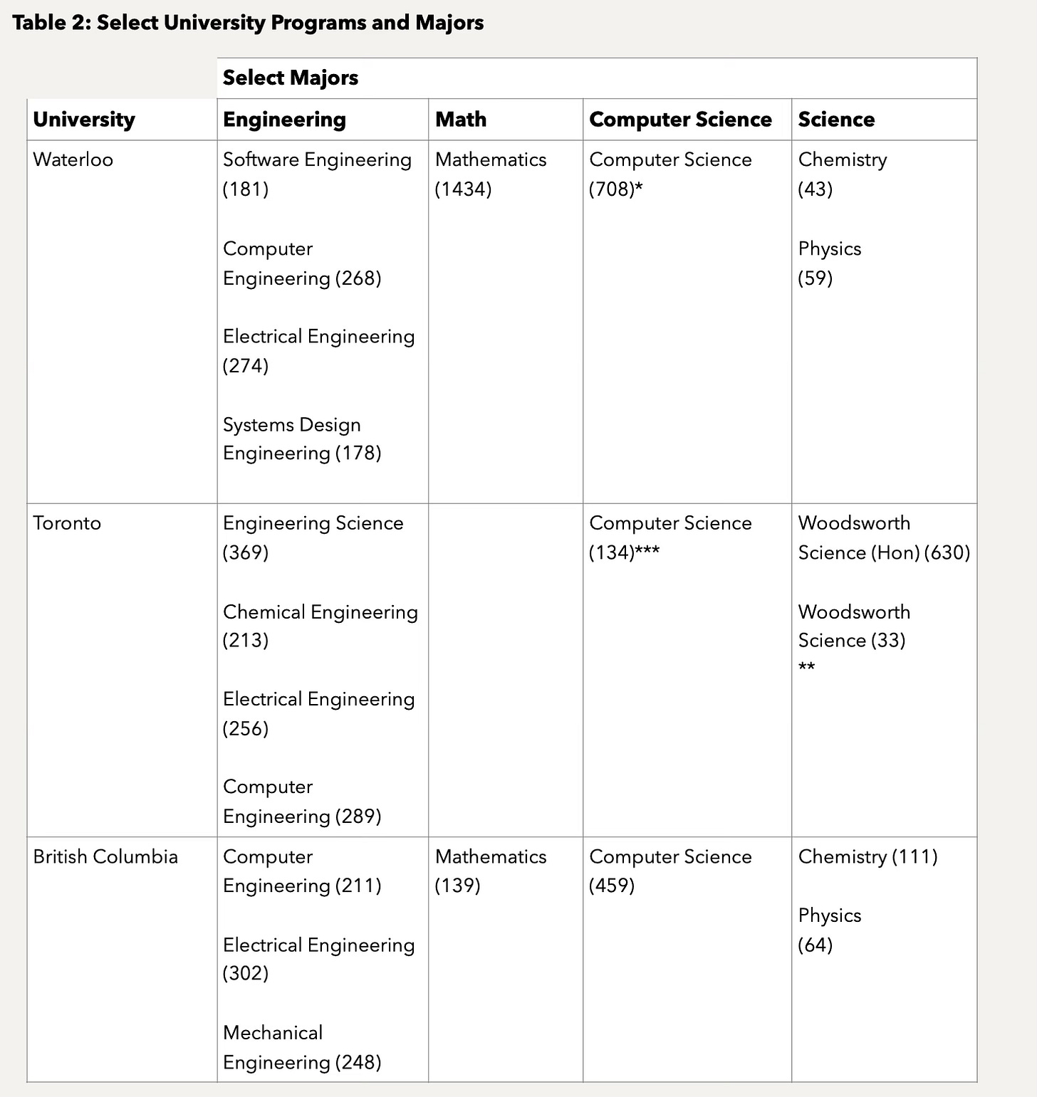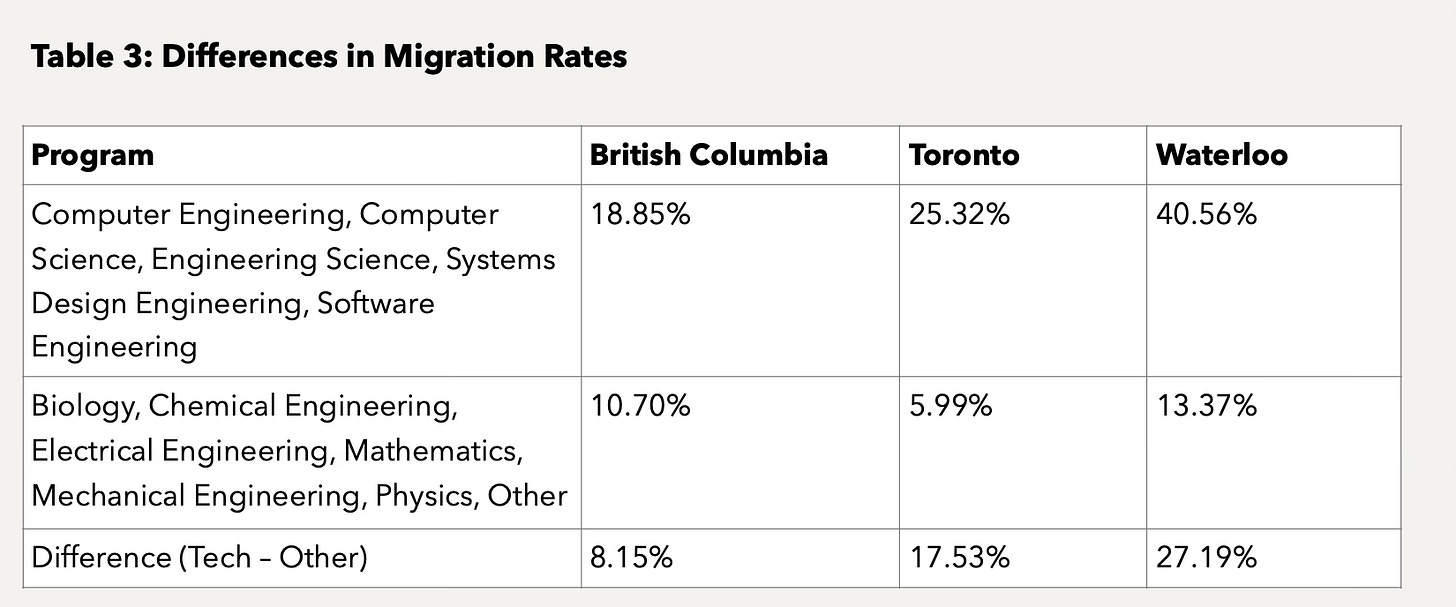 All that being said, tech folks are often the highlight of brain drain stats, but it’s more widespread than that. Reversing the Brain Drain: Where is Canadian STEM Talent Going?—one of the most comprehensive analyses published more than 10 years ago—shows us why. Succinctly, it’s important to account for absolute program sizes. While large proportions of software/CS students emigrate, these programs are relatively small compared to their other STEM counterparts.