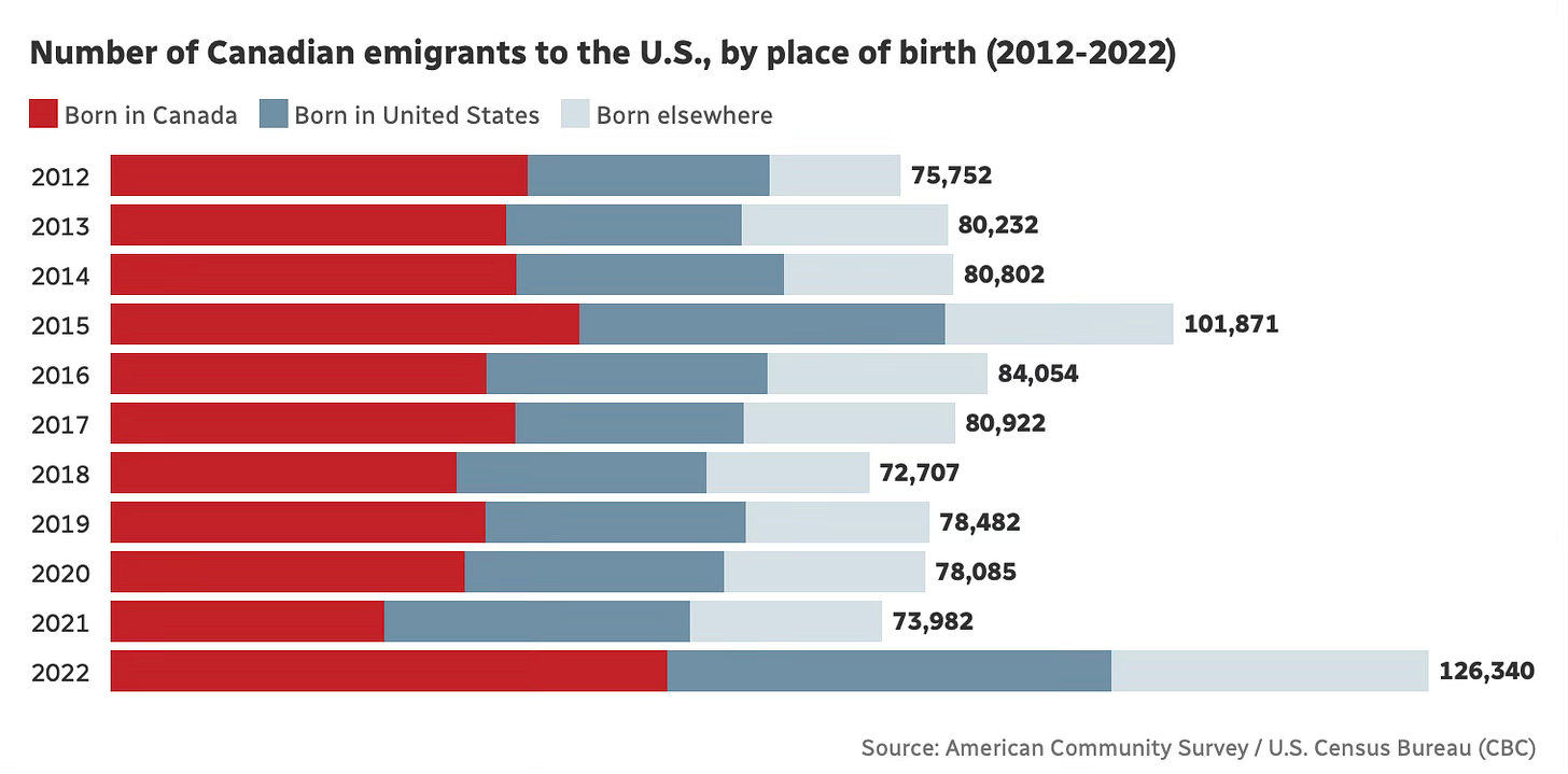 It would be easier to just tackle why software engineers are leaving Canada, but the allure of American jobs exists not only with new grads, but with professionals across the board: the ACS, which is conducted by the U.S. Census Bureau, says the number of people moving from Canada to the U.S. hit 126,340 in 2022. That's an increase of nearly 70 per cent over the 75,752 people who made the move in 2012.