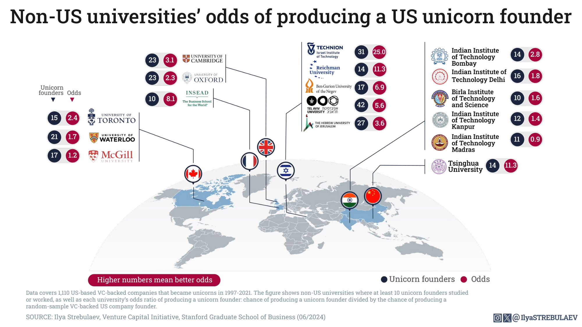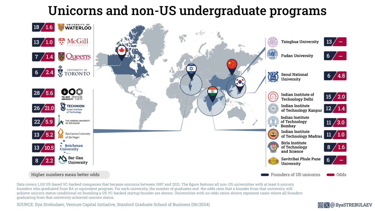 Non-US universities' odds of producing a US unicorn founder: Data covers 1,110 US-based VC-backed companies that became unicorns in 1997-2021. The figure shows non-US universities where at least 10 unicorn founders studied or worked, as well as each university's odds ratio of producing a unicorn founder: chance of producing a unicorn founder divided by the chance of producing a random-sample VC-backed US company founder.