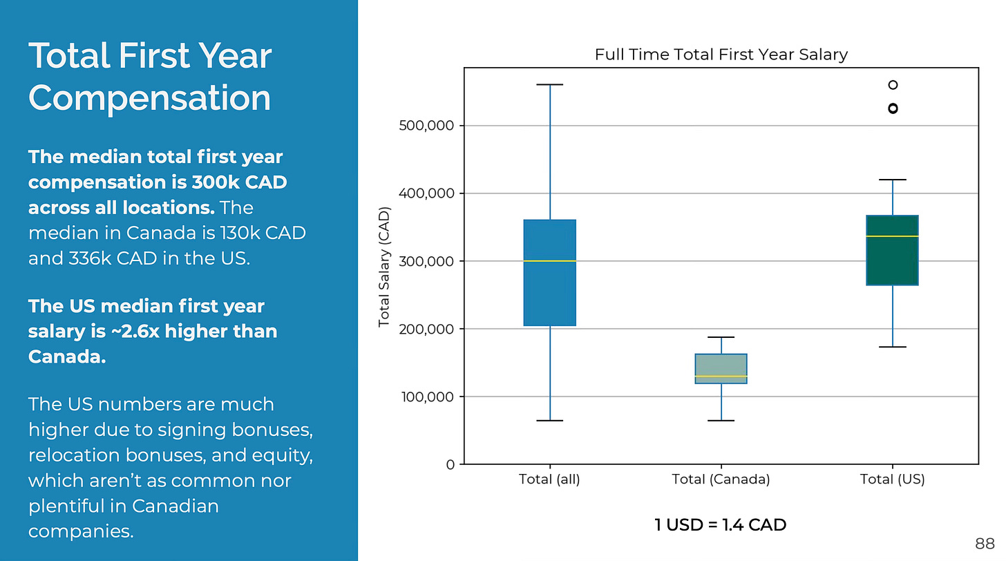 The disparity in the earnings distribution is wide. Median total compensation is ~3x higher in the US. The minimum reported total comp is ~6x higher in the US. Maximum total compensation out of school tells a similar story. Maximum compensation right out of school can be upwards of $800k compared to ~$280k in Canada. Granted, only a handful of students would earn in this top US income bucket at firms like Jane Street, HRT, and Jump (to name a few).